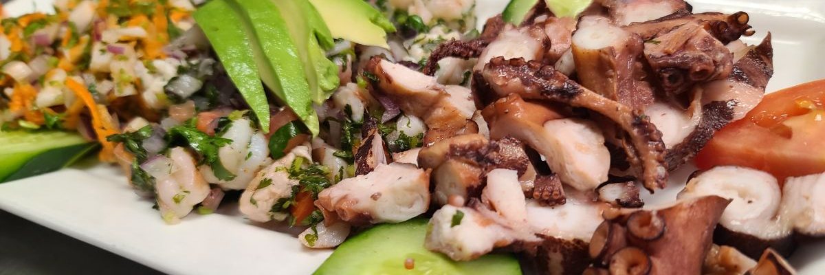 Shrimp, octopus, ceviche, scallops. crab, cucumber, avocado