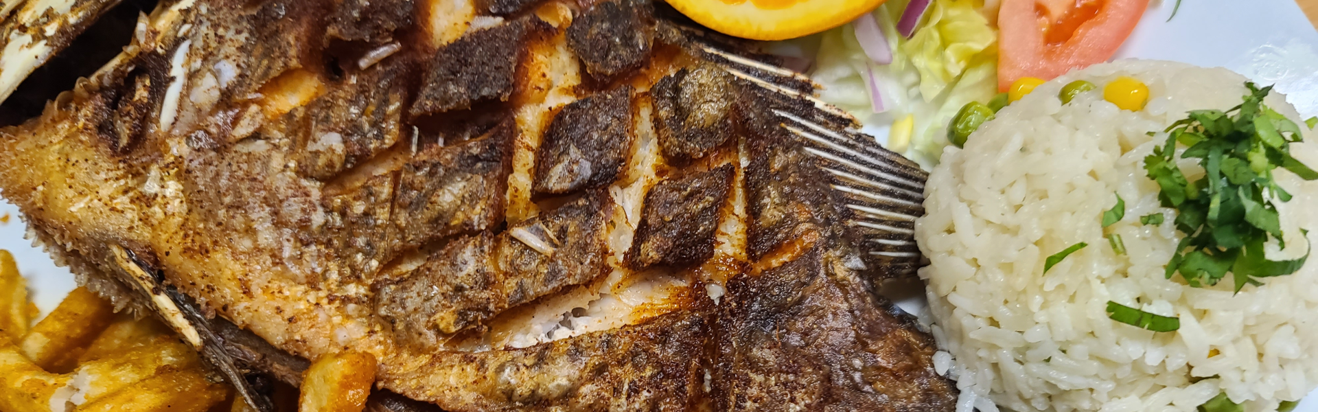 stuffed tilapia filet with peppers, onion, tomato, olives. Served with rice, fries & salad
