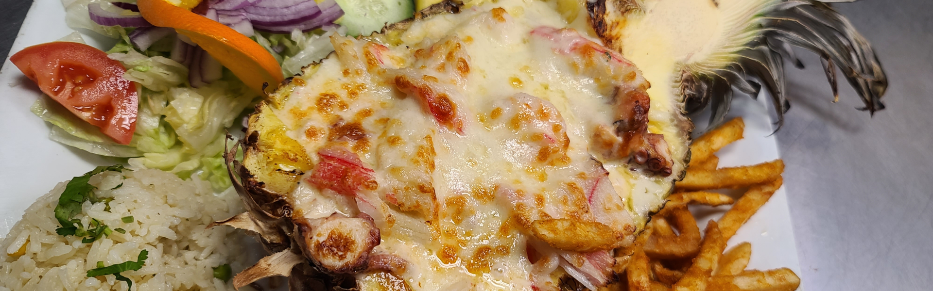 stuffed tilapia filet with shrimp, octopus, scallops, cheese. Served with rice, fries & salad